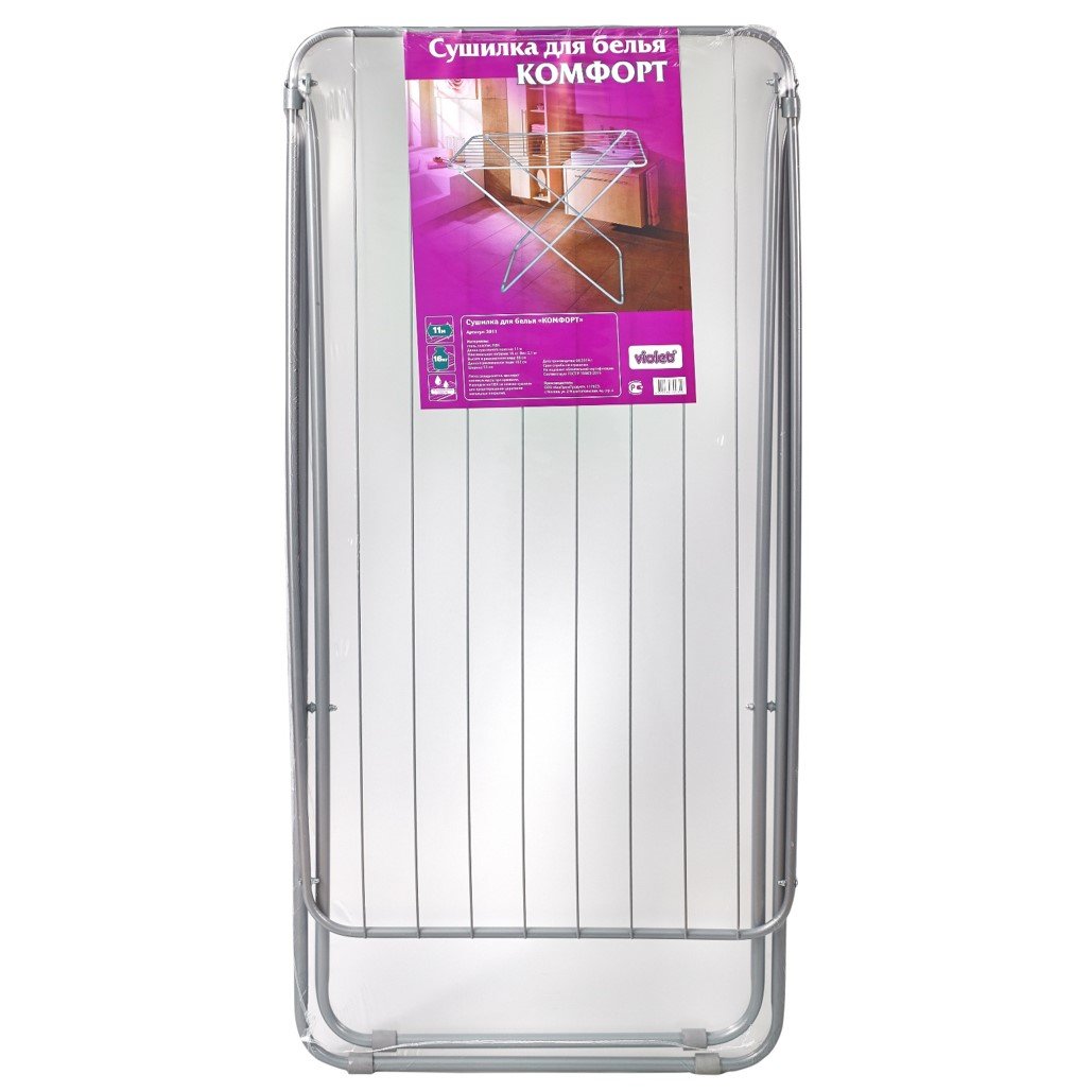 Напольная сушилка «Комфорт» - металлическая складная конструкция для размещения мокрого белья на горизонтальной поверхности. Сушильное полотно имеет длину 11м и выдерживает нагрузку в 16кг. Ножки сушилки оснащены пластиковыми накладками для предотвращения скольжения сушилки по поверхности пола.