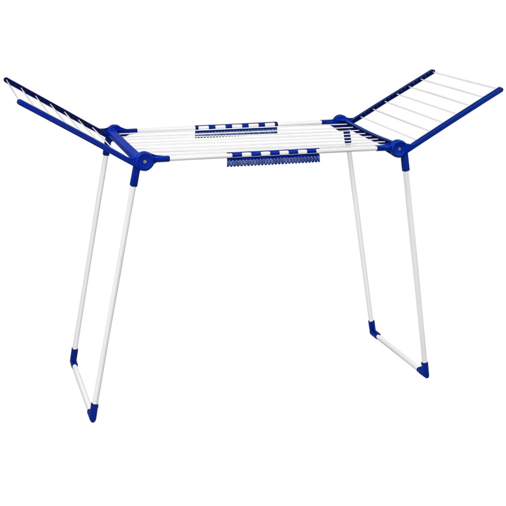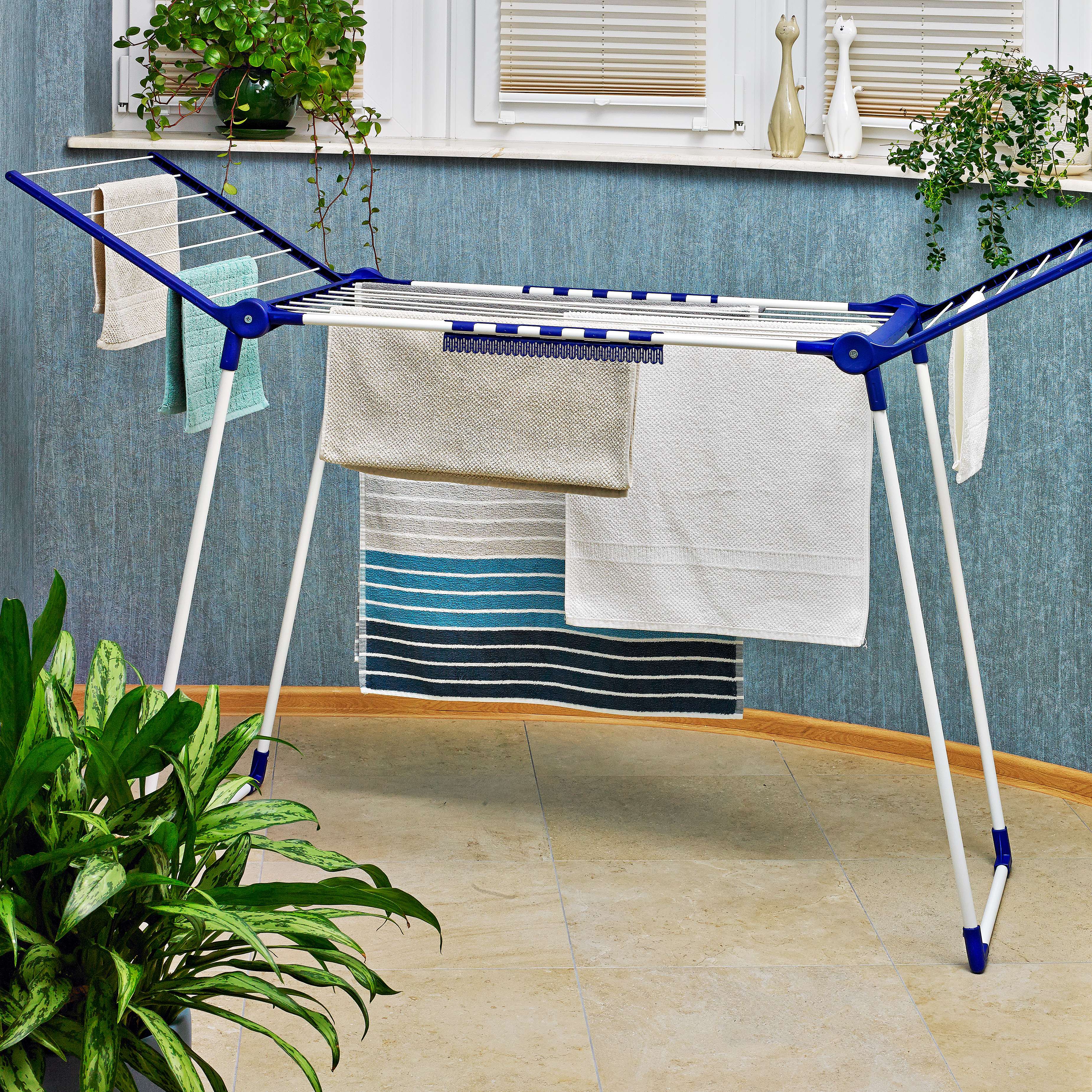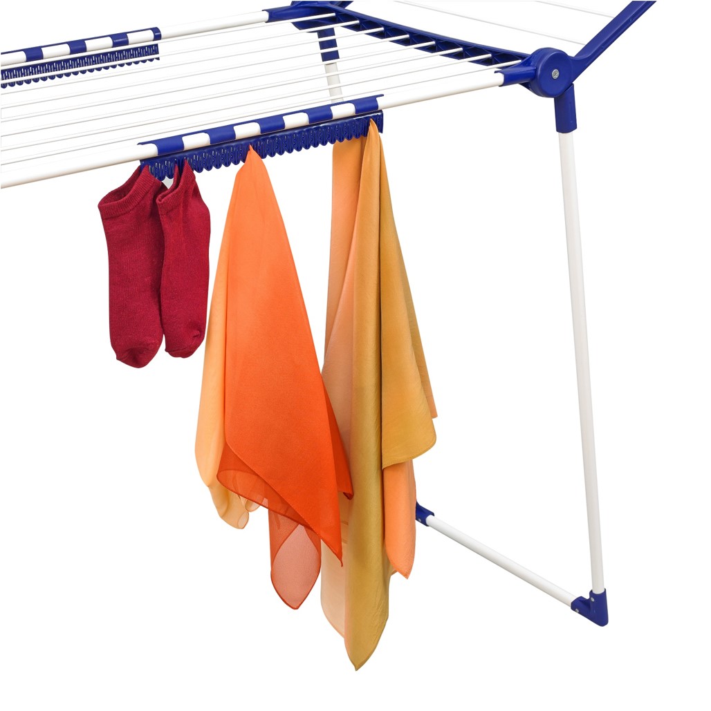 Напольная сушилка «Люкс» - металлическая складная конструкция для размещения мокрого белья на горизонтальной поверхности. Оснащена двумя откидными створками и пластиковыми накладками с креплениями для сушки нижнего белья, носков, платков. Сушильное полотно имеет длину 20м и выдерживает нагрузку в 20кг. Ножки сушилки оснащены пластиковыми накладками для предотвращения скольжения сушилки по поверхности пола.