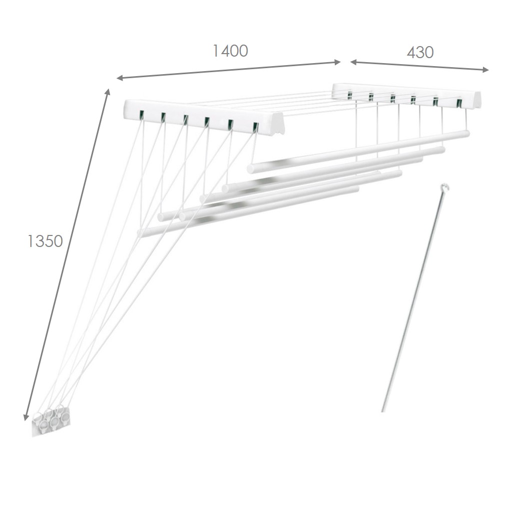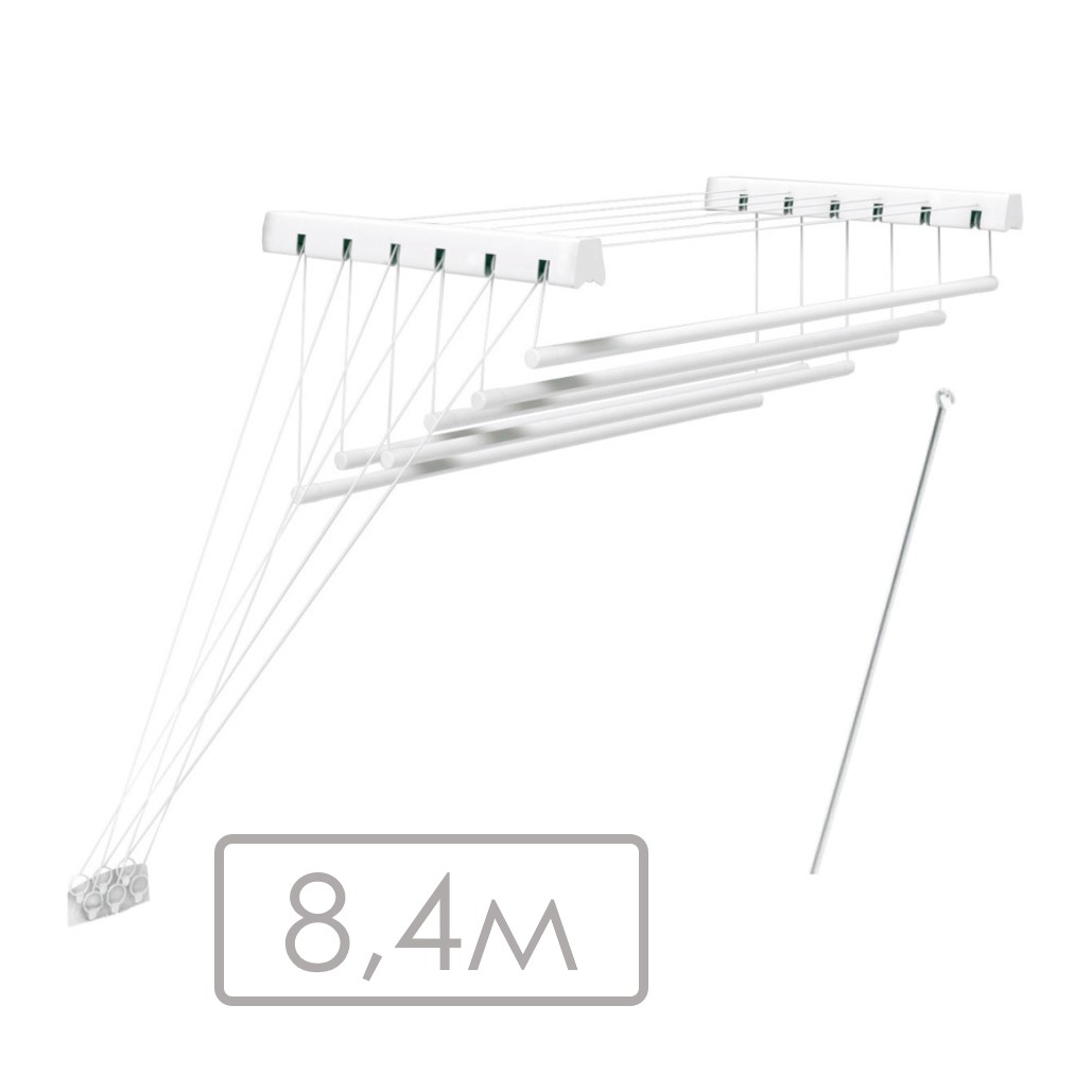 Сушилка для белья с возможностью крепления на стену или к потолку. Оптимальна для использования в ванной комнате или на балконе. Изготовлена из нержавеющей стали с полимерным порошковым покрытием, которое защищает от воздействия влаги и предотвращает механические повреждения. Представляет из себя конструкцию из крепежных кронштейнов, штанг-трубок, на которых развешивается бельё, и веревочной системы для фиксирования штанг на двух разных положениях: на высоте комфортной для развешивания белья и на высоте для сушки белья. Суммарная длина поверхности для размещения белья - 8,4м. Максимальная нагрузка - 12кг.