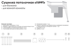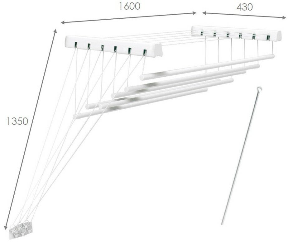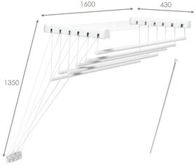 Сушилка для белья с возможностью крепления на стену или к потолку. Оптимальна для использования в ванной комнате или на балконе. Изготовлена из нержавеющей стали с полимерным порошковым покрытием, которое защищает от воздействия влаги и предотвращает механические повреждения. Представляет из себя конструкцию из крепежных кронштейнов, штанг-трубок, на которых развешивается бельё, и веревочной системы для фиксирования штанг на двух разных положениях: на высоте комфортной для развешивания белья и на высоте для сушки белья. Суммарная длина поверхности для размещения белья - 9,6м. Максимальная нагрузка - 12кг.