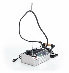 мощность утюга: 800 Вт; датчик давления, предохранительный клапан, индикатор отсутствия воды в бойлере, номинальный объём бойлера 1,1 л; время непрерывной работы до 1,5 часов