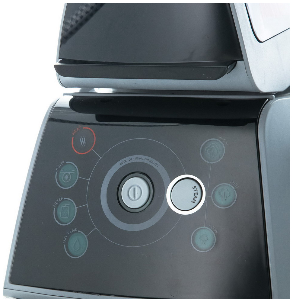 На корпусе парогенератора расположена панель управления. На ней есть кнопка включения питания со световым индикатором, а также кнопка переключения режимов подачи пара. Вы сможете настроить комфортный уровень подачи пара (сильный, средний или слабый) индивидуально для каждого изделия. На панели управления слева расположены индикаторы готовности пара, работы насоса, очистки от накипи и недостатка воды в резервуаре.