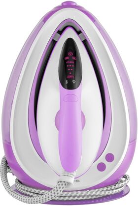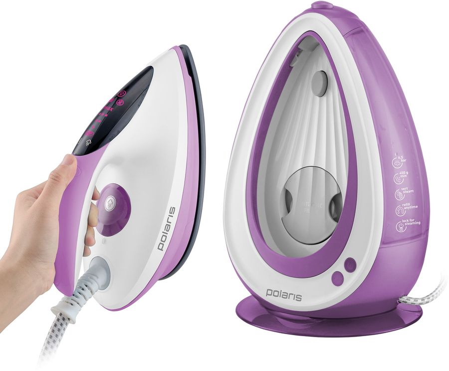 Особенности Электронное управление на ручке. Автоотключение при отсутствии воды. Замок для удобной переноски прибора. Удобная фиксация парового шланга и шнура на базе. Мощность 2400 Вт. Режимы работы: сухое глажение; мощность постоянного пара до 120 г/мин; вертикальное отпаривание.