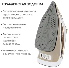 Утюг с пароувлажнением оснащен функцией вертикального пара и функцией увлажнения. Предусмотрено автоматическое отключение. Модель имеет высокоэффективную керамическую подошву с уникальной в своем роде подошвой с выемкой под пуговицы. В утюге предусмотрены сухой или паровой режимы глажения. Система против образования накипи и противокапельная система. Прозрачный резервуар для воды, 400 мл.