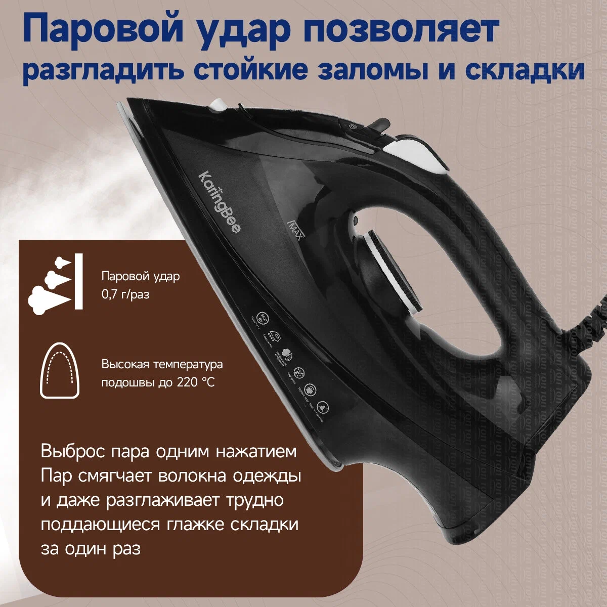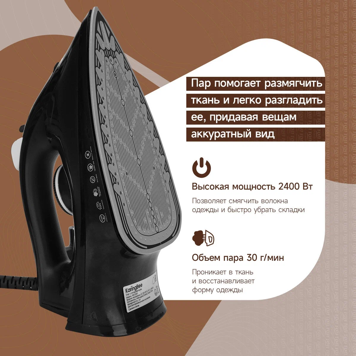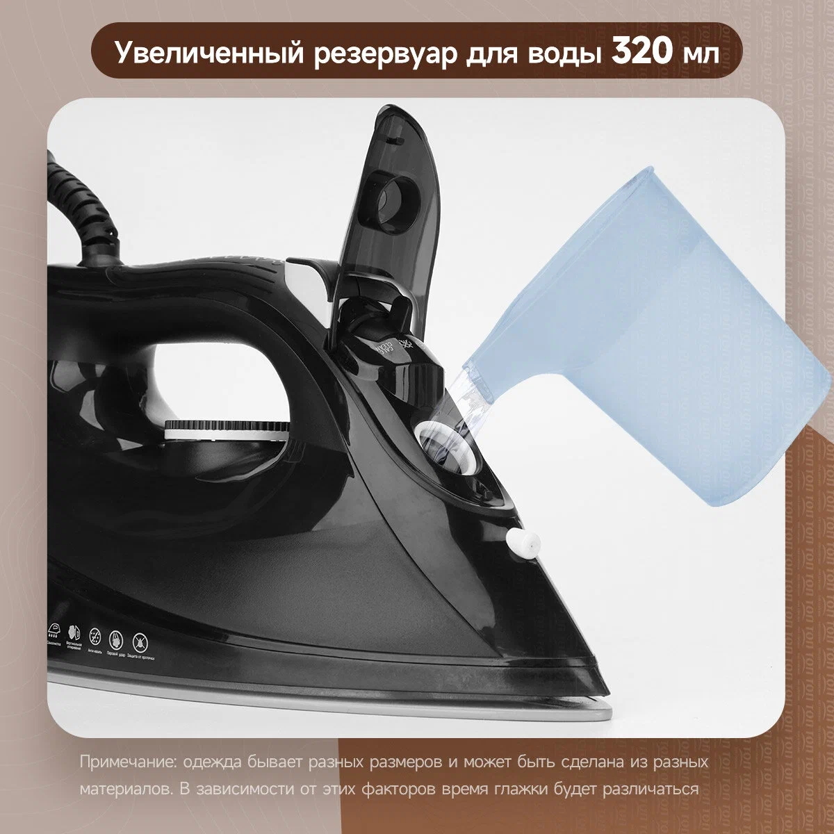 Особенности утюга, отпаривателя: Противокапельная система, Очистка от накипи, Распылитель для воды, Функция самоочистки, Вертикальное отпаривание