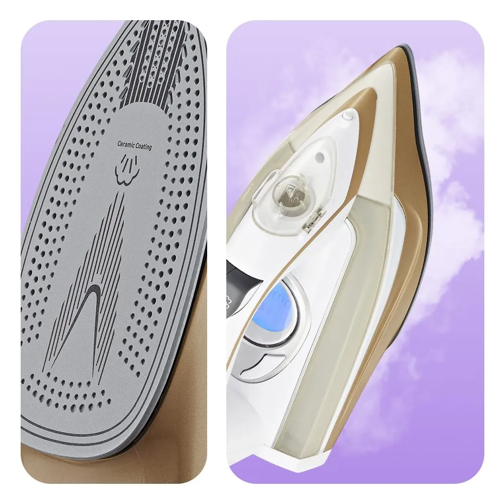 Подошва утюга имеет керамическое покрытие, благодаря которому утюг хорошо скользит и легко очищается. Такое покрытие убережёт ткани от затяжек и лишних складок.