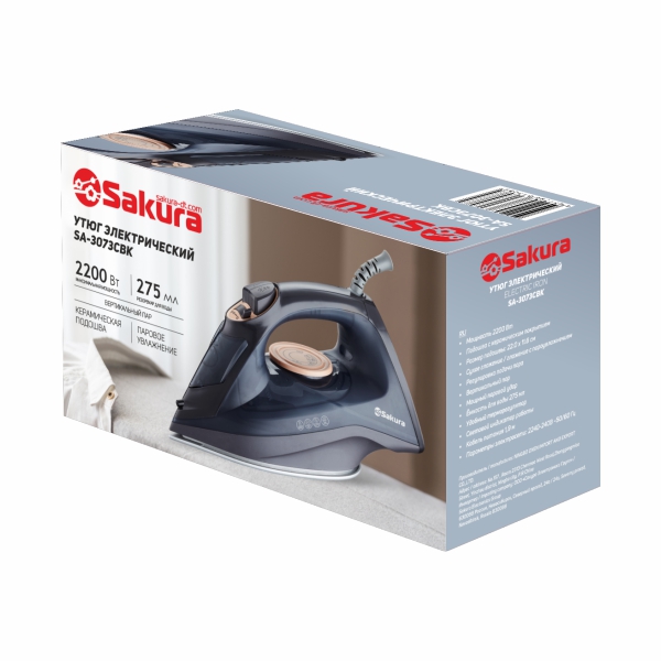 Утюг. Мощность 2200 Вт, резервуар д/воды 220 мл, подошва керамика (220х117 мм), регулируемый термостат, распылитель воды, регулятор интенсивности пара, вертикальное отпаривание, паровой удар, автоочистка, мерный стакан, общая длина шнура питания 1,9 м.