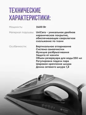 Особенности утюга, отпаривателя: Вертикальное отпаривание, Защита от накипи, Распылитель для воды