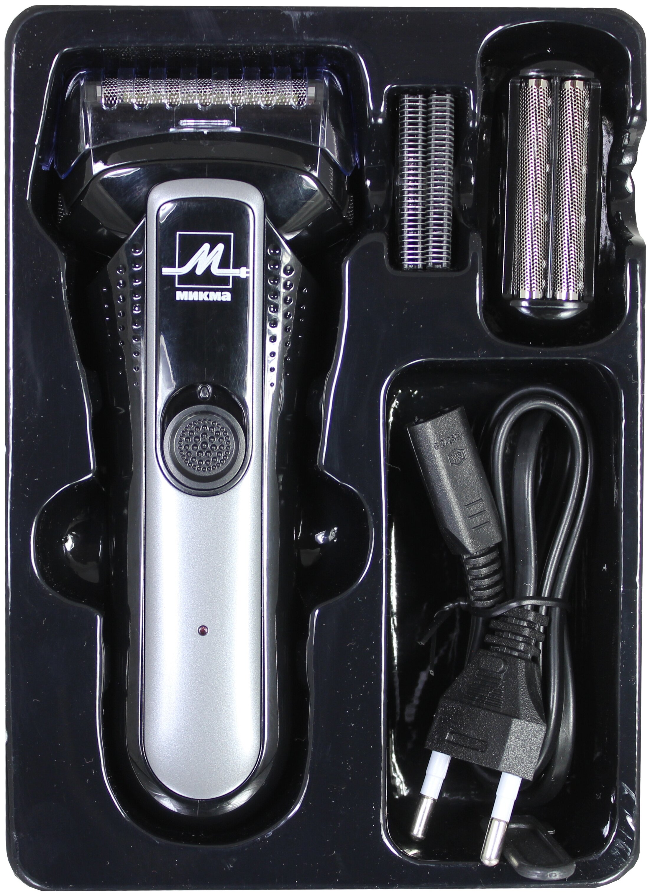 запасная головка с сетками, комплект подвижных ножей, двусторонняя щетка для чистки, зарядное устройство
