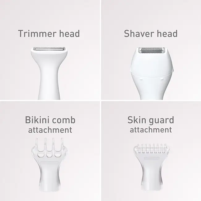 Триммер и бритва аккуратно и быстро подстригают густые волосы в зоне бикини, обеспечивая гладкую поверхность. Более того, и корпус, и головка являются водонепроницаемыми.