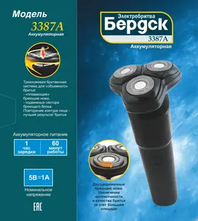 Электробритва "БЕРДСК" модель 3387А - электроприбор личной гигиены, предназначенный для сухого бритья. Прибор предназначен для использования в домашних условиях.