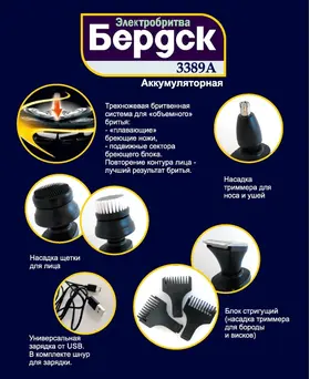 Электробритва "БЕРДСК" модель 3389А - электроприбор личной гигиены, предназначенный для сухого бритья. Прибор предназначен для использования в домашних условиях. Прибор состоит из корпуса и насадки. В зависимости от установленной насадки может быть использован в качестве электробритвы, триммера для висков, триммера для носа, щетки для лица.