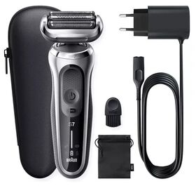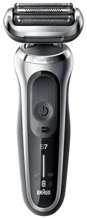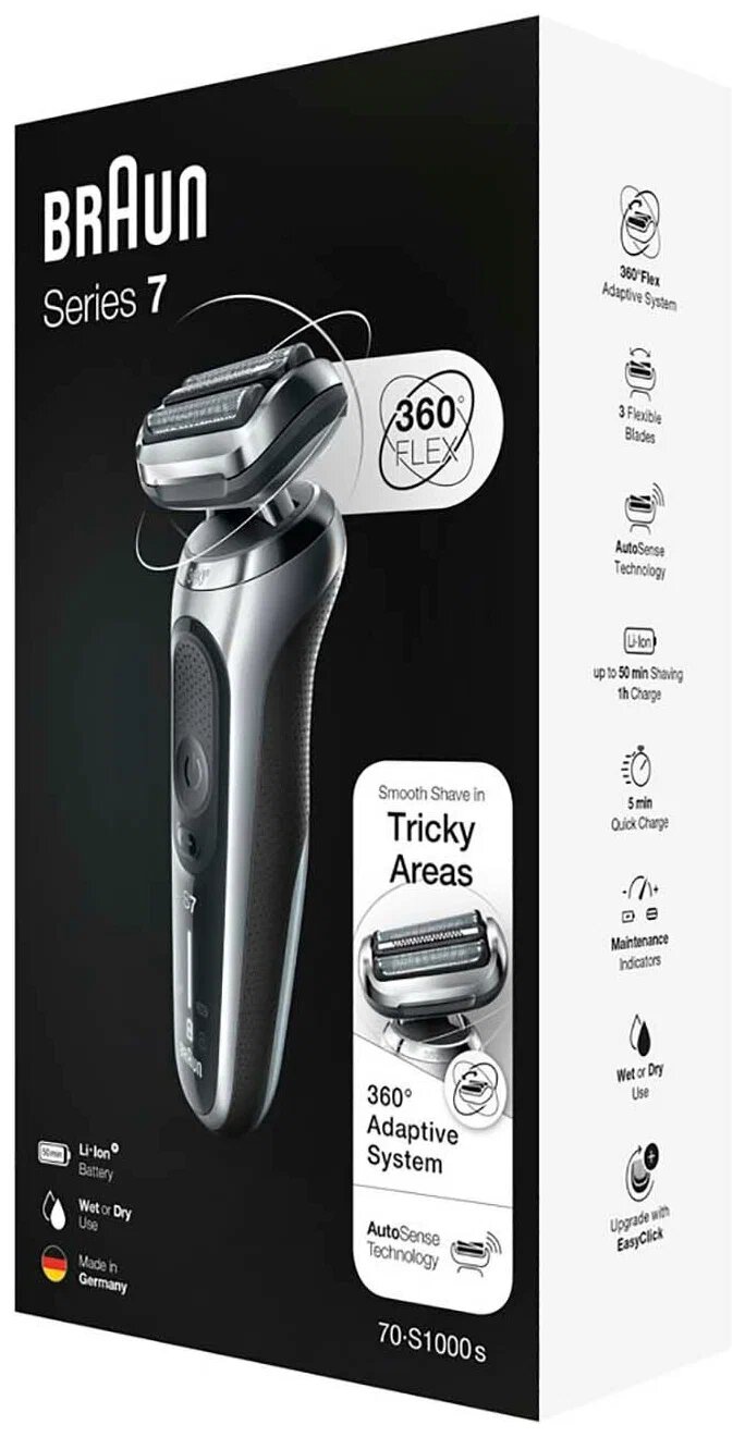 Подробная комплектация: электробритва Braun Series 7, зарядное устройство SmartPlug, дорожный футляр, щеточка для чистки