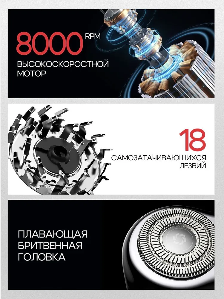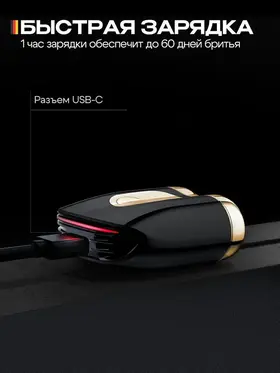Влагозащищенный корпус, Быстрая зарядка, Зарядка от USB-порта, Плавающие головки, Чистка под струей воды, Ножи из нержавеющей стали, Самозатачивающиеся ножи