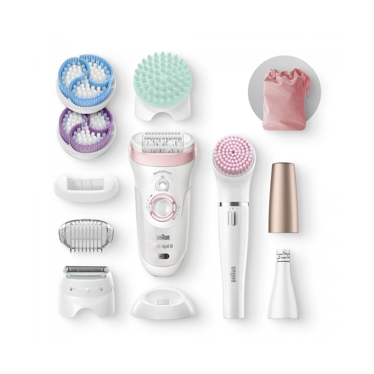 В комплекте: Эпилятор Braun Silk-epil 9 SkinSpa SensoSmart,эпилятор для лица Braun FaceSpa,насадка для глубокого массажа,щёточка для глубокого пилинга,щёточка для мягкого пилинга,насадка для более близкого контакта с кожей,бритвенная насадка,насадка-триммер,щёточка для чувствительной кожи,косметичка