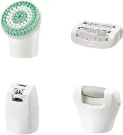 В комплект входят эпиляционные головки для ног/рук и зоны бикини/подмышек, насадка для деликатной эпиляции, насадка для пилинга, насадка для стоп и подравнивания зоны бикини.