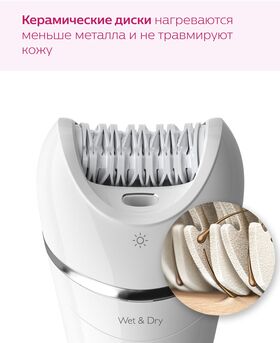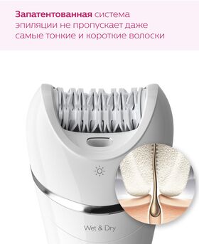 для влажной и сухой эпиляции; в комплекте 4 насадки; максимальная скорость вращения: 70400 об/мин; количество элементов питания: 1; тип аккумулятора: Li-Ion