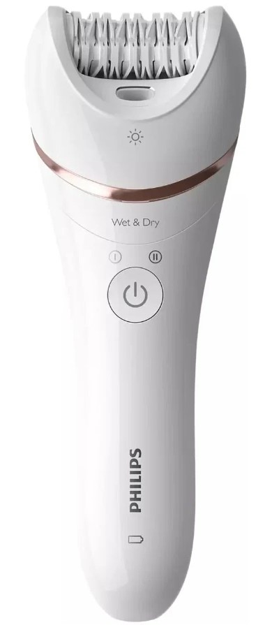 эпилятор, бикини-триммер с гребнем, бритвенная головка, насадка для оптимального контакта, насадка для пилинга тела, насадка для чувствительных участков, насадка-гребень, насадка-триммер для линии бикини, чехол, щеточка для чистки, зарядное устройство