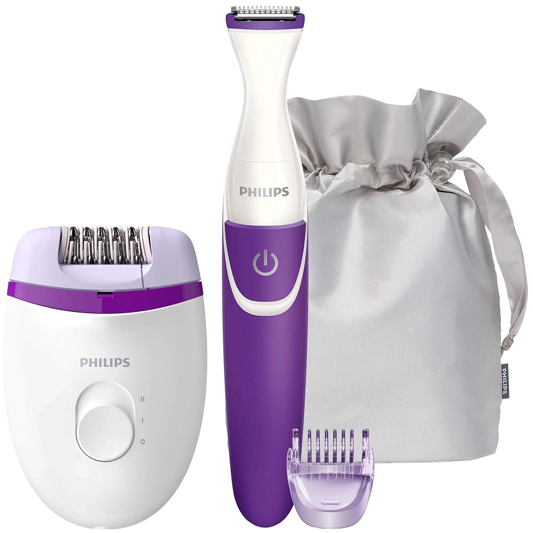 эпилятор, насадка-гребень для подравнивания волос до длины 3 мм, триммер для линии бикини, чехол, щеточка для чистки, 2 батарейки АА