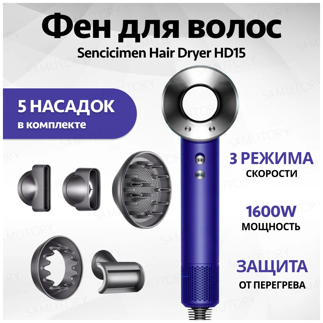 фен, насадка-концентратор для создания мощного потока воздуха, диффузор для проработки локонов, насадка для создания направленного потока, насадка для непослушных волос, инструкция