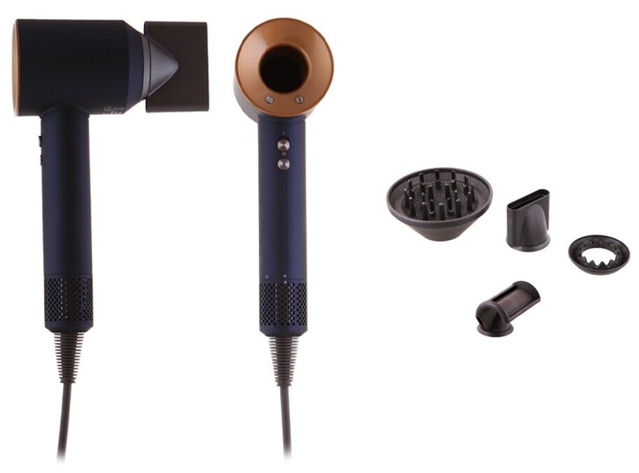 Фен для волос; 5 магнитных насадок: насадка концентратор, насадка диффузор, для непослушных волос, для бережного высушивания, для создания направленного потока; инструкция.
