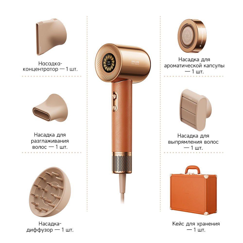 Комплектация Фен Dreame Hair Miracle, насадка-концентратор, насадка для разглаживания волос, насадка-диффузор, насадка для ароматической капсулы, насадка для выпрямления волос, картридж с эссенцией, кейс для хранения