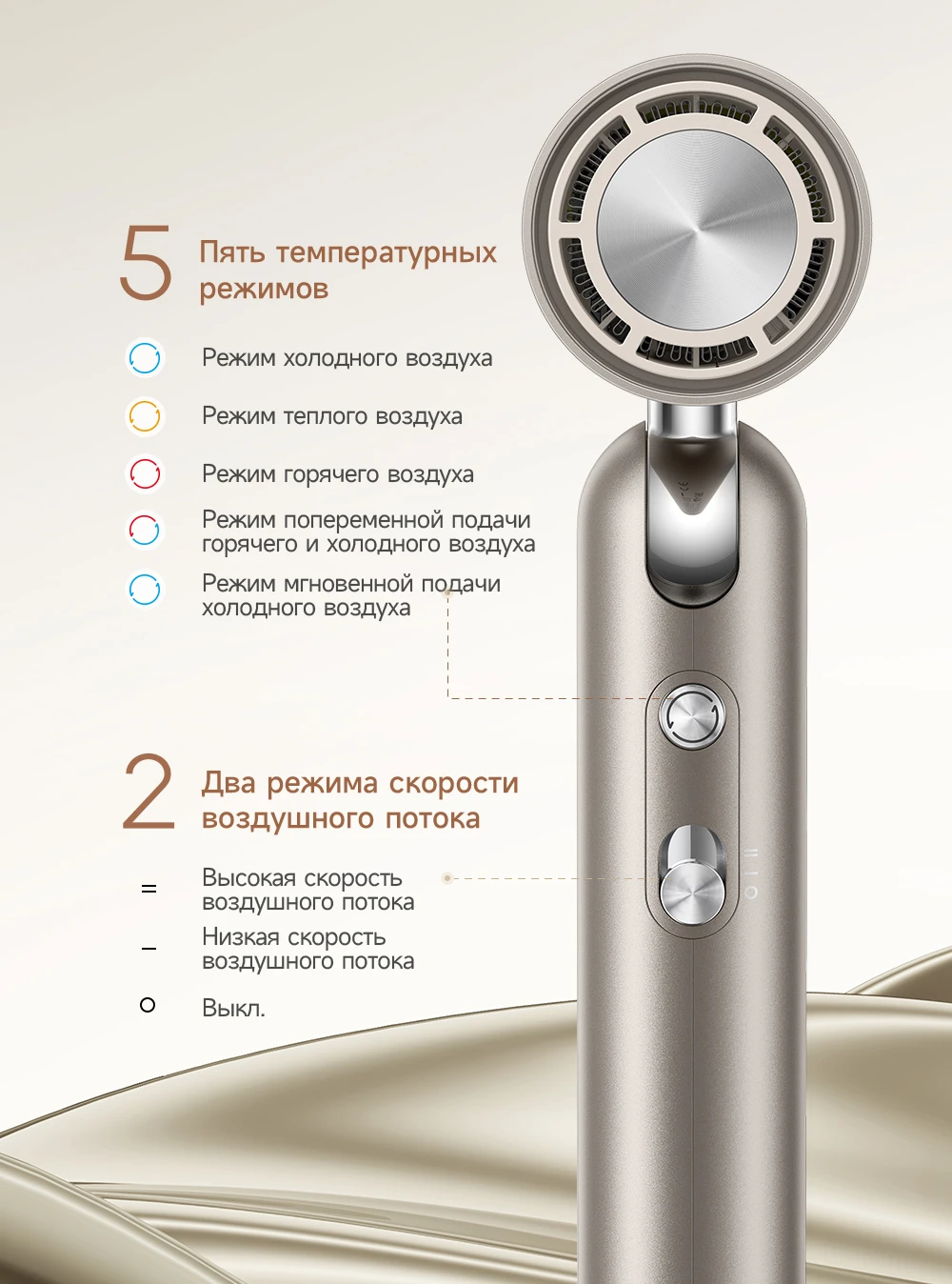 Особенности Элегантный дизайн, Бережная сушка при 57℃, Ионизация, Пять температурных режимов