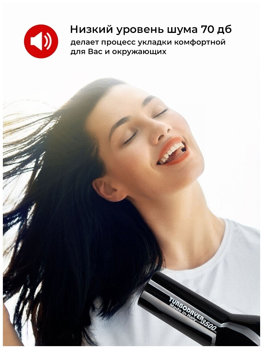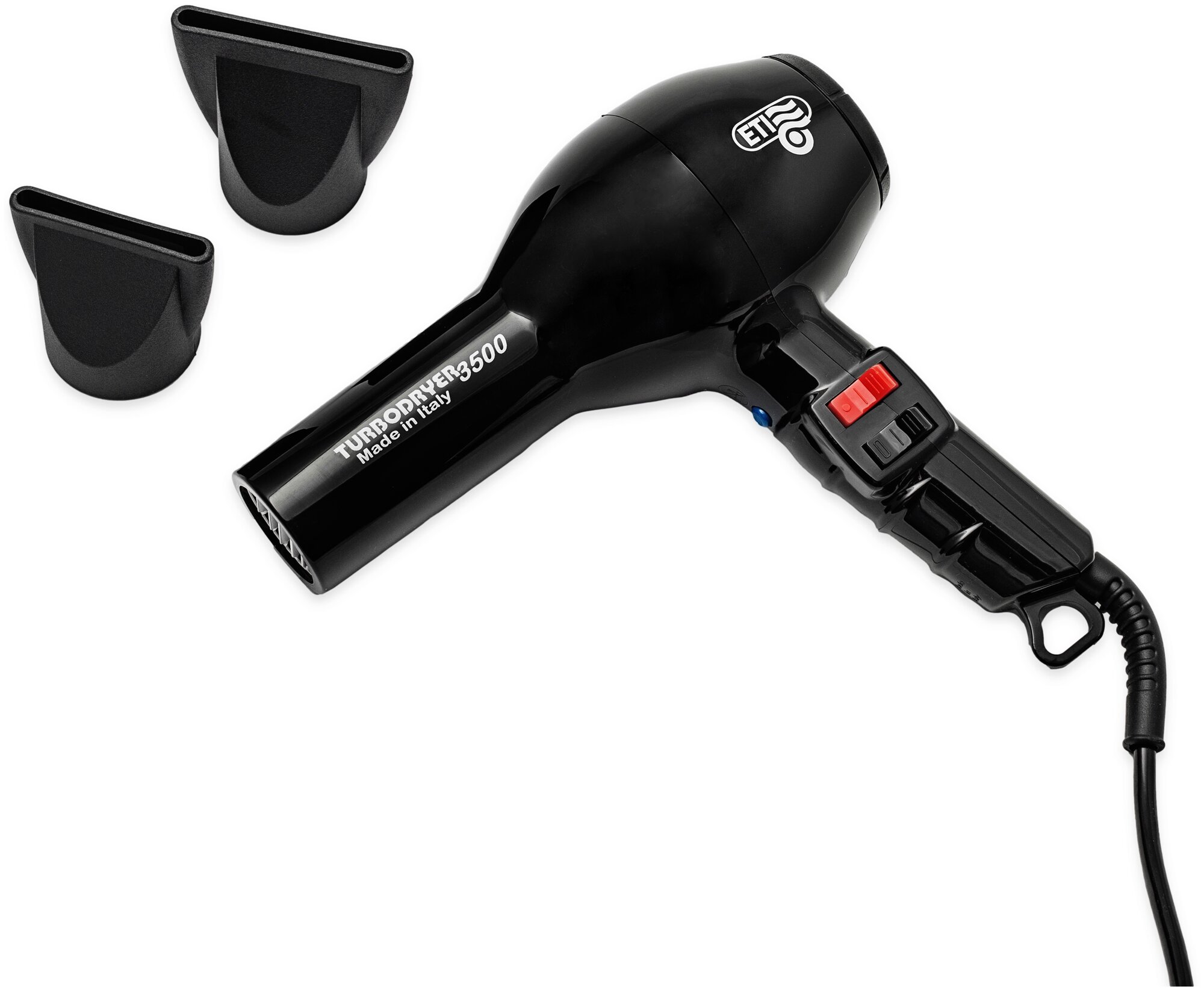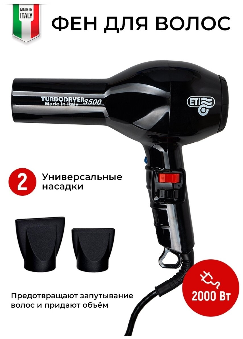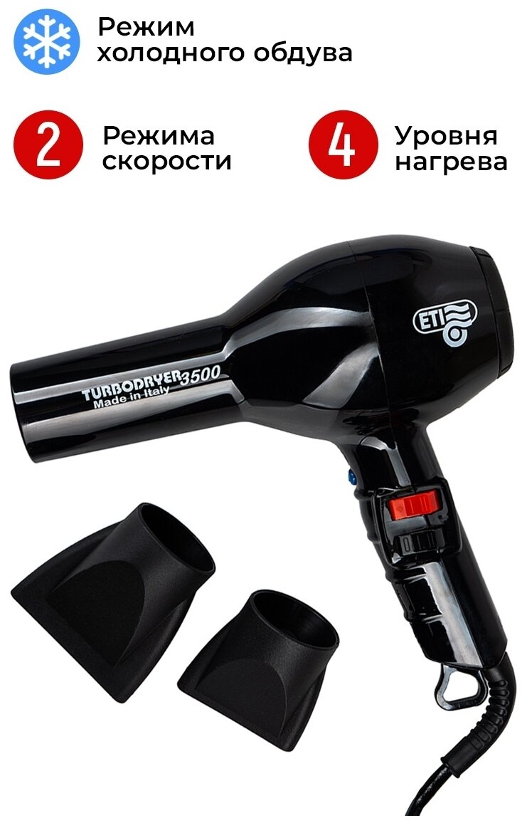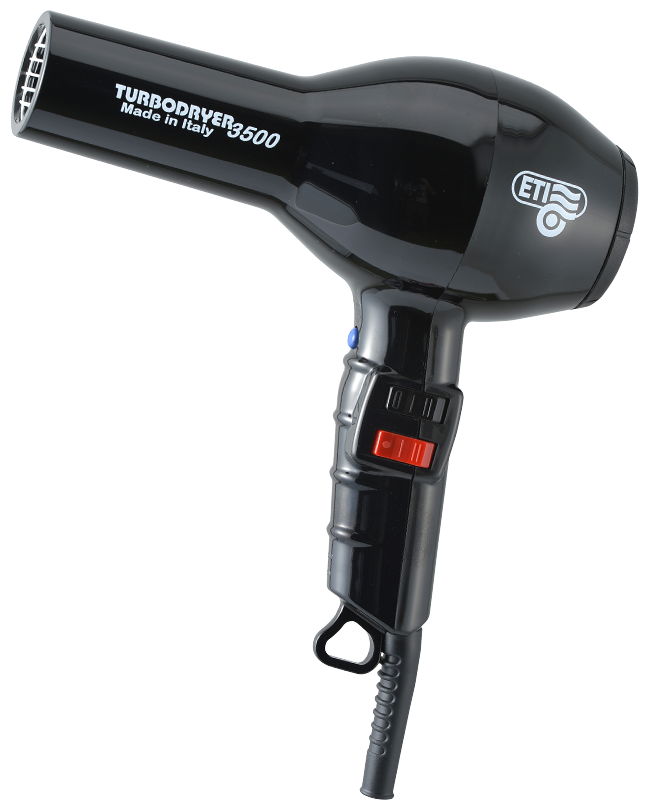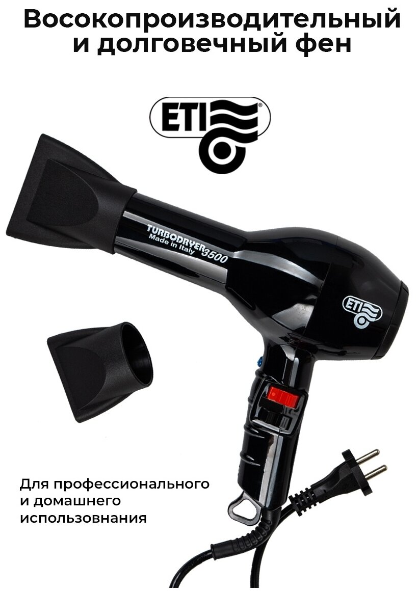 Профессиональный фен ETI Turbodryer 3500 для мастеров своего дела. Создан для ежедневной работы в условиях салона. Современный мощный мотор переменного тока с ресурсом 2500 часов работы не перегревается. Равномерно нагревает воздух и быстро переключается между температурами. Стильный фен для укладки отличается от других не только основными характеристиками, но и продуманным дизайном. Обдув воздуха равномерно распределяется по всей длине. Ручка комфортно ложится в руку. Положение кнопок позволяет удобно переключаться между 4 температурными режимами и двумя скоростями. Вес фена 595 грамм совершенно не ощущаются в руке, благодаря оптимальному распределению веса. Решетка воздухозаборника легко снимается и очищается. Длина провода 3 метра позволяет свободно перемещаться вокруг рабочего пространства. Мощность 2000 Вт. Мотор: АС. Скорость воздушного потока: 83 м куб/час. Шум: 70 дБ. Режим холодного обдува: есть. Керамическая решётка. Две насадки в комплекте. Сделано в Италии.