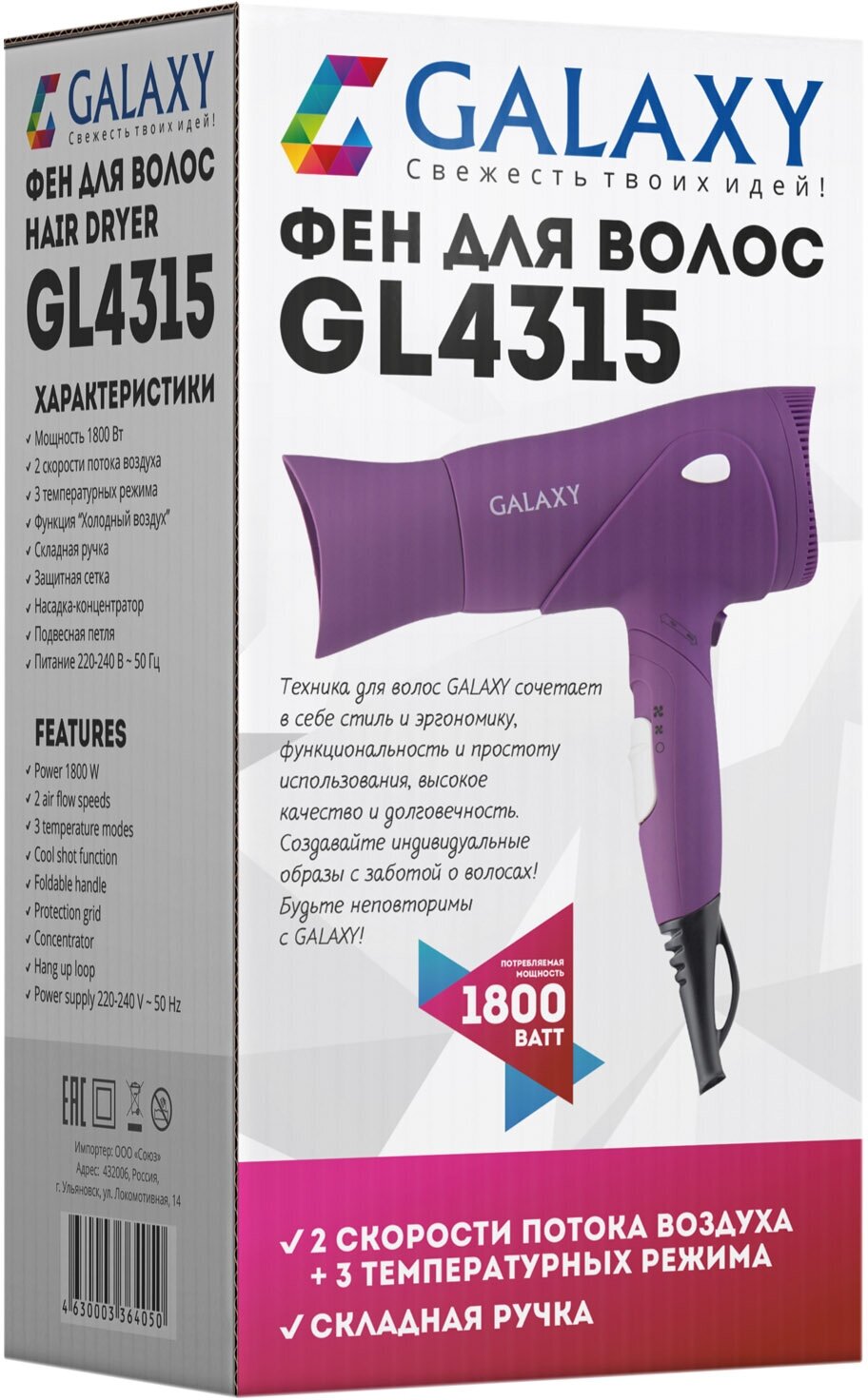 Универсальный и качественный фен GALAXY GL4315 для сушки и быстрой укладки волос. Благодаря складной ручке и подвесной петле фен удобен в хранении и транспортировке. Двухступенчатая регулировке мощности вентилятора и 3 уровня нагрева удовлетворят любые индивидуальные потребности и помогают справиться со сложными укладками. Дополнительная функция Холодный воздух обеспечивает бережную укладку и закрепляет ее на длительное время. Узкая насадка-концентратор ускоряет сушку, облегчает укладку, помогает справиться с различными видами укладки. Габариты 13,8х9,5х2,6 см.