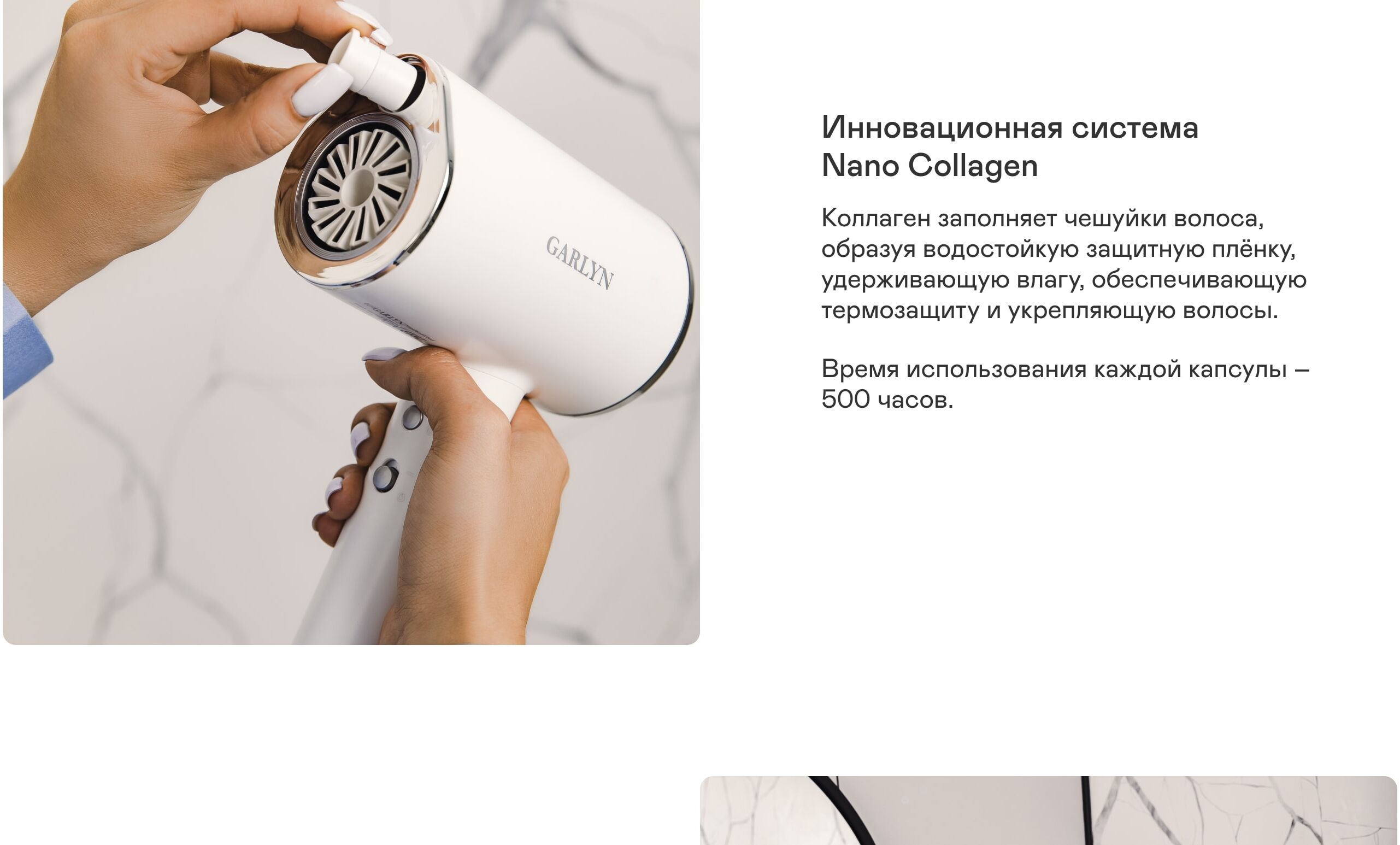 Фен - 1 шт.; Насадка-концентратор - 1 шт.; Насадка-диффузор - 1 шт.; Капсула Nano Collagen - 2 шт.; Руководство пользователя - 1 шт.; Краткая инструкция пользователя - 1 шт.