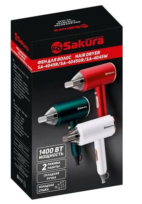 Фен для волос Sakura SA-4045GR имеет мощность 1400 Вт, 2 режима (теплый воздух + средняя скорость, горячий воздух + высокая скорость), кнопка Cool Shot (сушка холодным воздухом), насадка-концентратор, защита от перегрева.