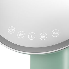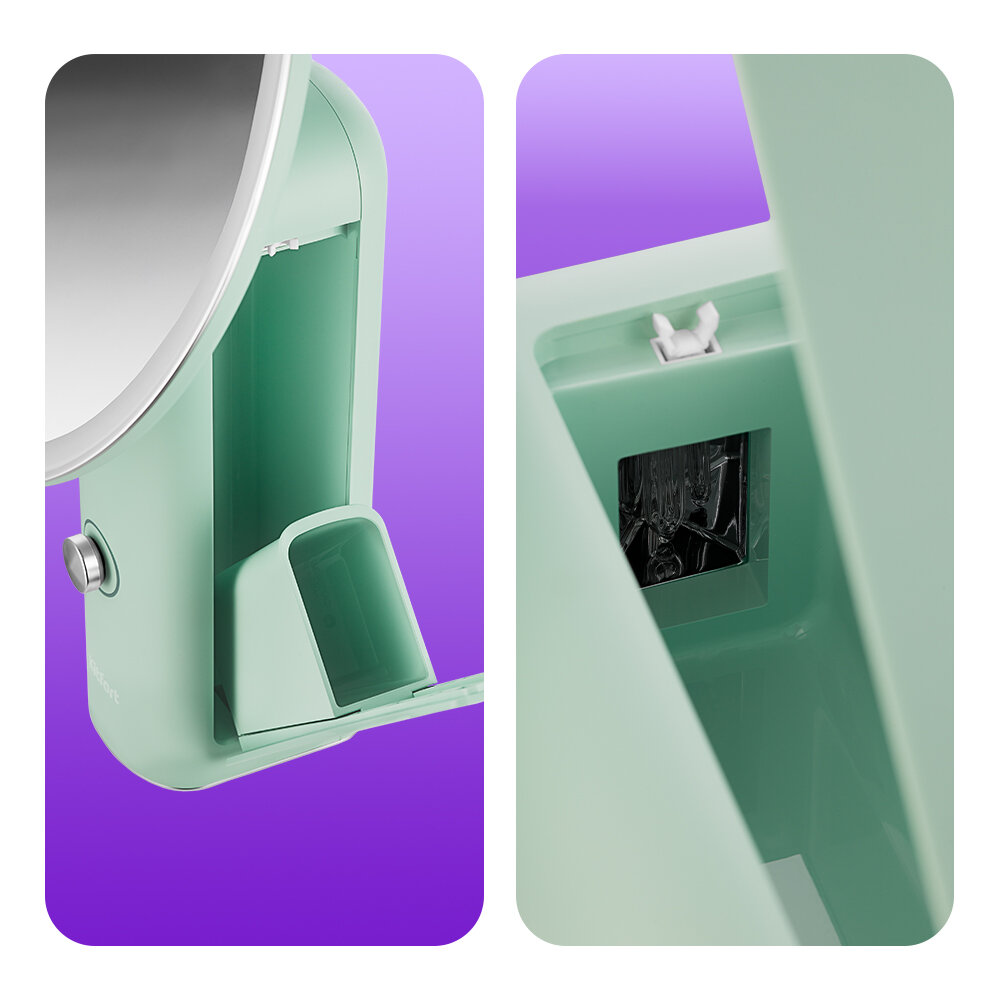 В ножке зеркала есть специальный отсек для обеззараживания кистей и косметологических инструментов. Нажмите на верхнюю часть отсека, чтобы открыть его. В открывающейся части установлен съёмный контейнер для инструментов. Внутри отсека находится УФ-лампа.