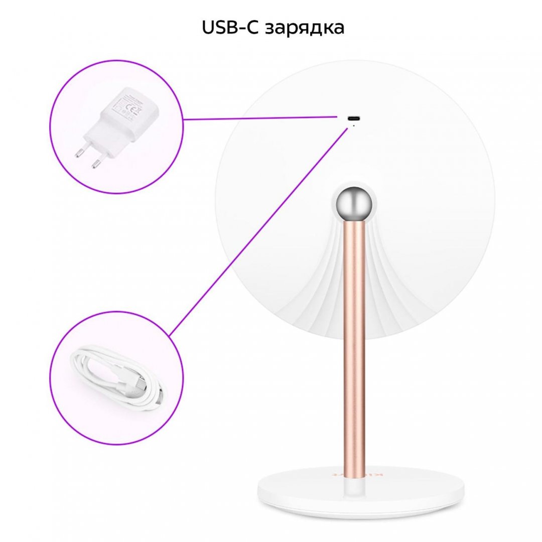 В комплекте маленькое зеркало с 10-кратным увеличением, которое крепится на магниты на основную часть зеркала. Длина шнура USB Туре-С: 0.7 м. Мощность: 5 Вт.
