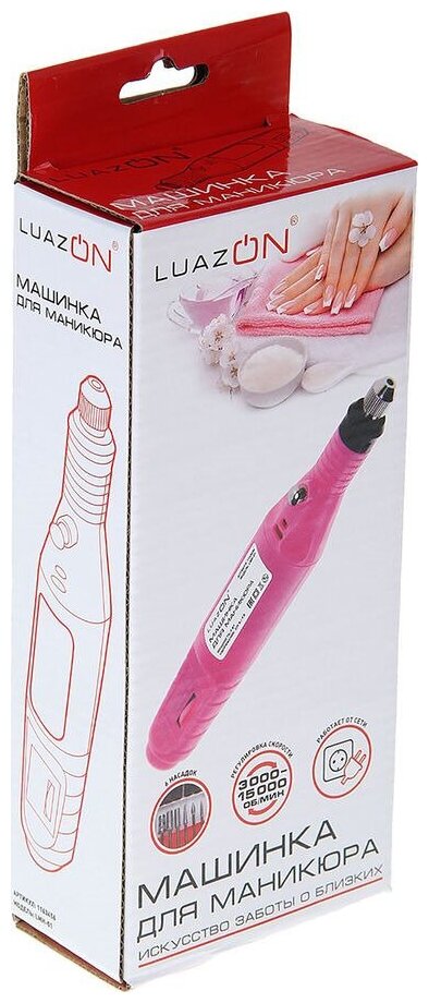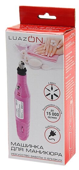 Аппарат для маникюра LuazON LMH-01, 6 насадок, 5 Вт, 3000-15000 об/мин, розовый. Аппарат для маникюра и педикюра (фрезер) позволяет работать как с натуральными, так и с нарощенным ногтями. С его помощью можно создать форму ногтей, отшлифовать поверхность, изменить толщину ногтевых пластин, удалить кутикулу и заусенцы.