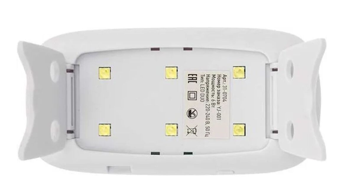 Корпус лампы прямой обтекаемой формы выполнен из высококачественного пластика, складные ножки не перекрывают диоды, поэтому есть возможность сушить ногти даже в сложенном состоянии. Конструкция крепления складных ножек выполнена качественно: они легко раскладываются, не разболтаются и фиксируются в сложенном положении. На боковой панели находится разъем для подключения шнура питания и кнопка активации. Быстрое нажатие кнопки активирует режим таймера на 45 секунд, а для того, чтобы запустить таймер на 60 секунд, следует удерживать кнопку питания 1-2 секунды. Данная лампа удобно подключается через кабель USB к ноутбуку, power-bank и прочим устройствам питания с соответствующим разъёмом (что особенно важно в поездках - вдали от сетевой розетки), а также и к стандартной сети 230В через любой сетевой адаптер с разъёмом USB.