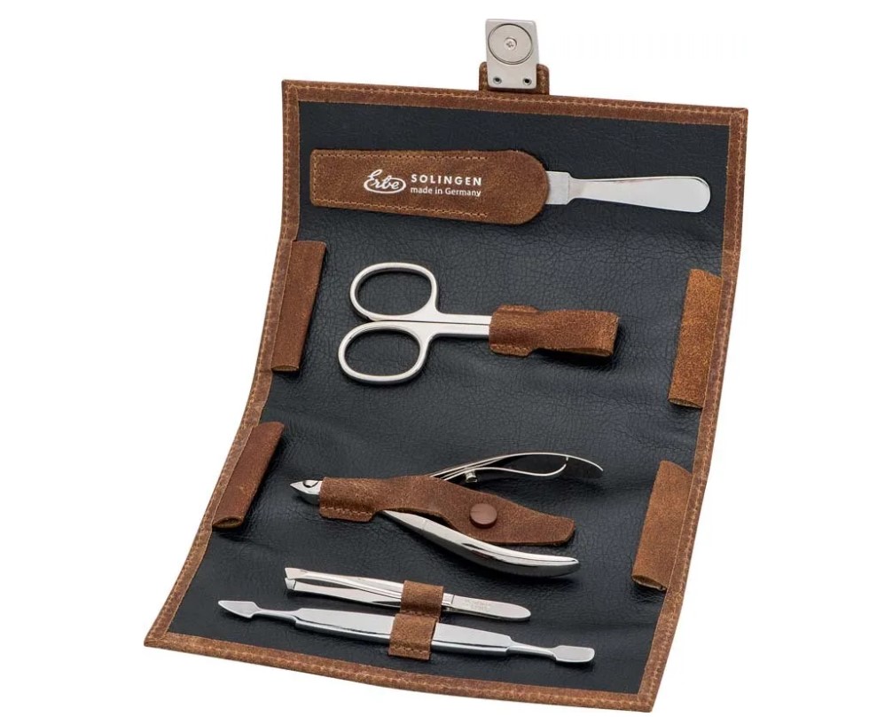 Маникюрный набор Erbe 94980ER – это набор премиум-класса, входит в категорию высочайшего качества! Набор выполнен в виде ролла, чехол заворачивается и обеспечивает дополнительную защиту инструментов. Чехол набора 94980ER - является предметом уникального мастерства, имеет длительный срок хранения, изготовлен из лучших воловьих шкур! Выполнен в глубоком коричневом цвете, необычайно мягкий и приятный на ощупь. Внутри набора – никелированные инструменты ручной заточки, выполненные из нержавеющей стали. На инструментах выгравирован фирменный логотип “Erbe Solingen”. В набор входят: ножницы для ногтей, кусачки для кутикулы, маникюрный шабер двухсторонний, пинцет наклонный, пилка металлическая. Набор произведен в Германии, в городе Золинген. Размер 15,5 x 2 x 6 см