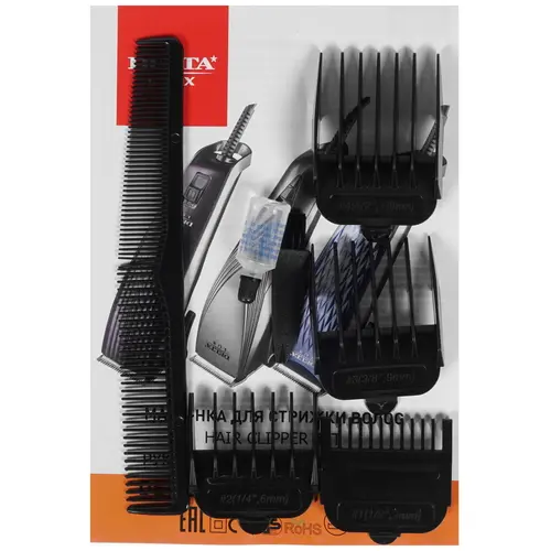 4 насадки для стрижки, защитная крышка, масло, расческа, щетка