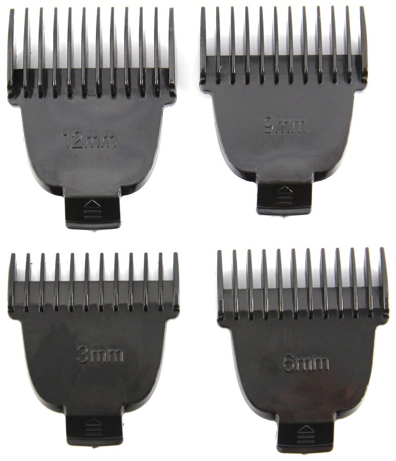 - 4 насадки для стрижки (3, 6, 9, 12 мм), щетка для чистки лезвий, масленка для машинки