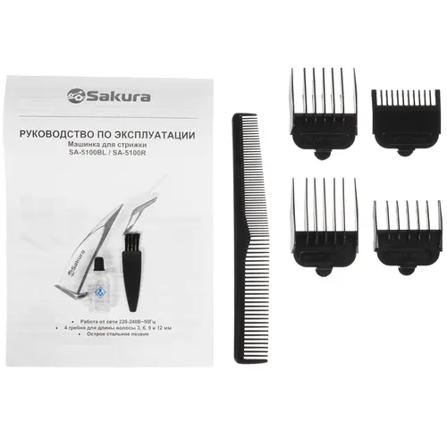Лезвия машинки для стрижки Sakura SA-5100R изготовлены из нержавеющей стали. Благодаря специальной заточке лезвия легко срезают нужную длину волос, не цепляя их и не выдергивая. Для их очищения предусмотрена щеточка (в комплекте), а также масло для смазки. Наличие защитной крышки у машинки позволяет безопасно хранить ее или перевозить в багаже. Для стабильной работы машинка подключается к электросети с помощью сетевого кабеля.