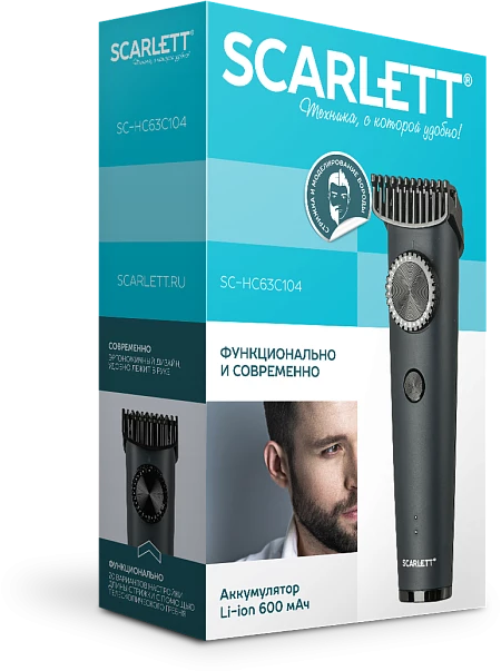 Машинка для стрижки волос Scarlett SC-HC63C104 оборудована емкой литиево-ионной батареей, которая способствует автономному функционированию на протяжении 90 минут. Модель может работать от стандартной электросети. Благодаря этому можно закончить стрижку, если аккумулятор разрядился. Это способствует комфортной эксплуатации. На корпусе расположен поворотный регулятор, с помощью которого изменяют длину среза. За счет этого удобно создавать короткие стрижки, придавать форму бороде, усам и бакенбардам.