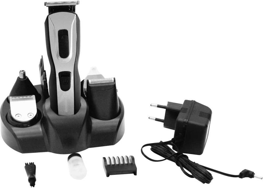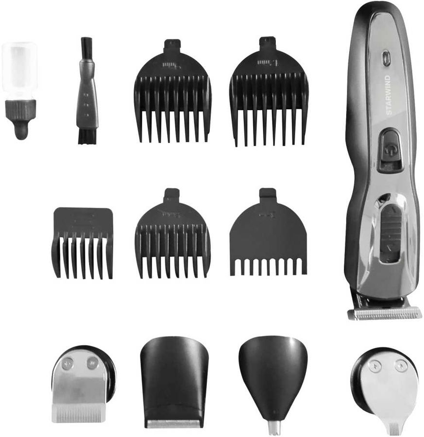 Особенности В комплекте: база для хранения, 5 сменных головок (для стрижки волос, триммер для бороды, бритва, триммер для точных линий и триммер для носа и ушей), 4 гребня (3/6/9/12мм), адаптер, масло для смазки и щеточка для чистки. ВАЖНО! Своевременная чистка и регулярная смазка продлевают срок службы.