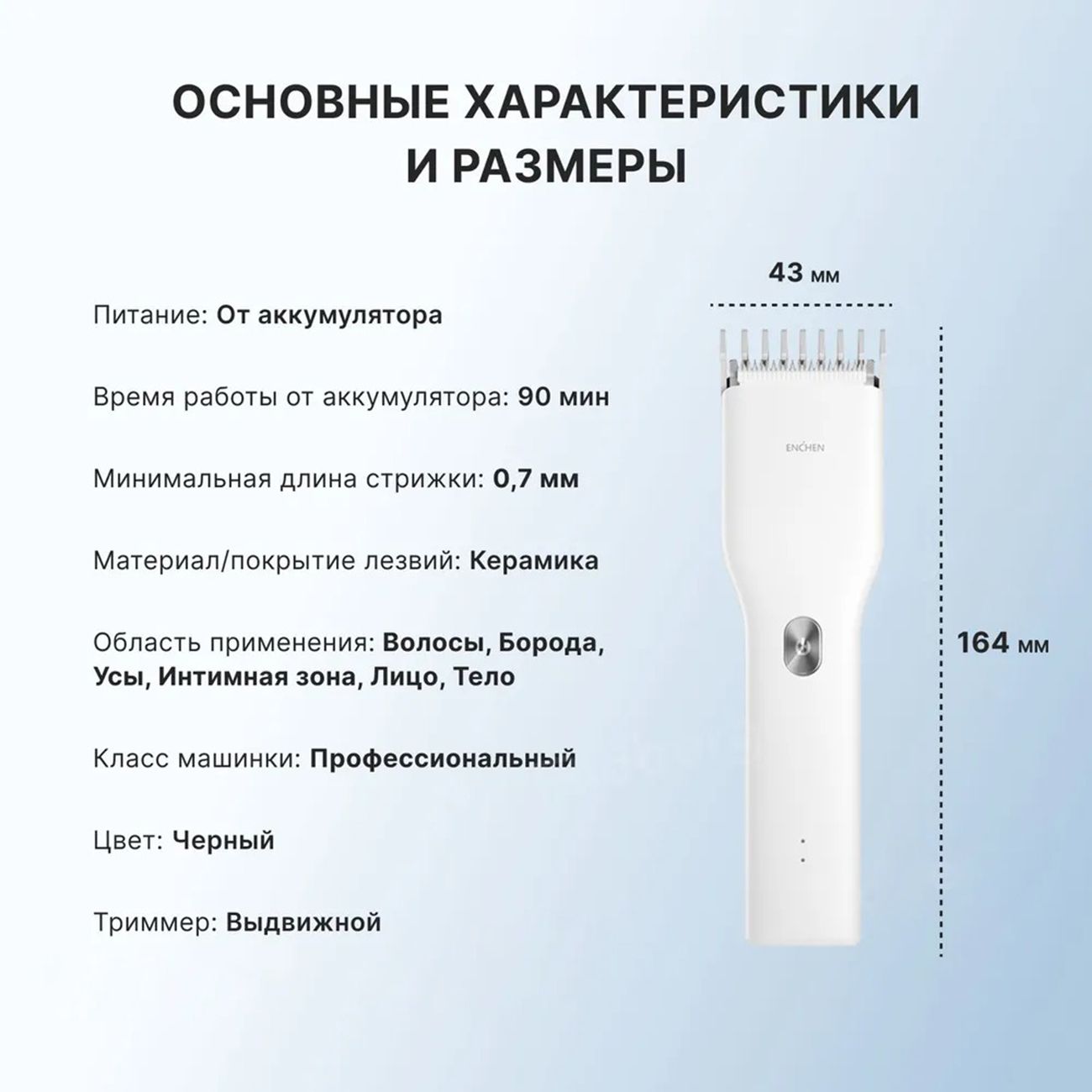 Поддерживается быстрая зарядка, 100% заряда — за 1 час. Время автономной работы — 90 минут. То есть в течение 3 месяцев можно пользоваться триммером по 30 минут. В работе Enchen Boost бесшумна, а все благодаря режущей головке из керамики, уровень шума — менее 55 дБ.