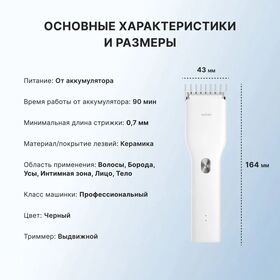 Машинка для стрижки волос оснащена нанокерамической головкой, на корпусе располагается кнопка управления и порт USB Type-C. Возможна регулировка желаемой длины прически от 0.7 до 21 мм.