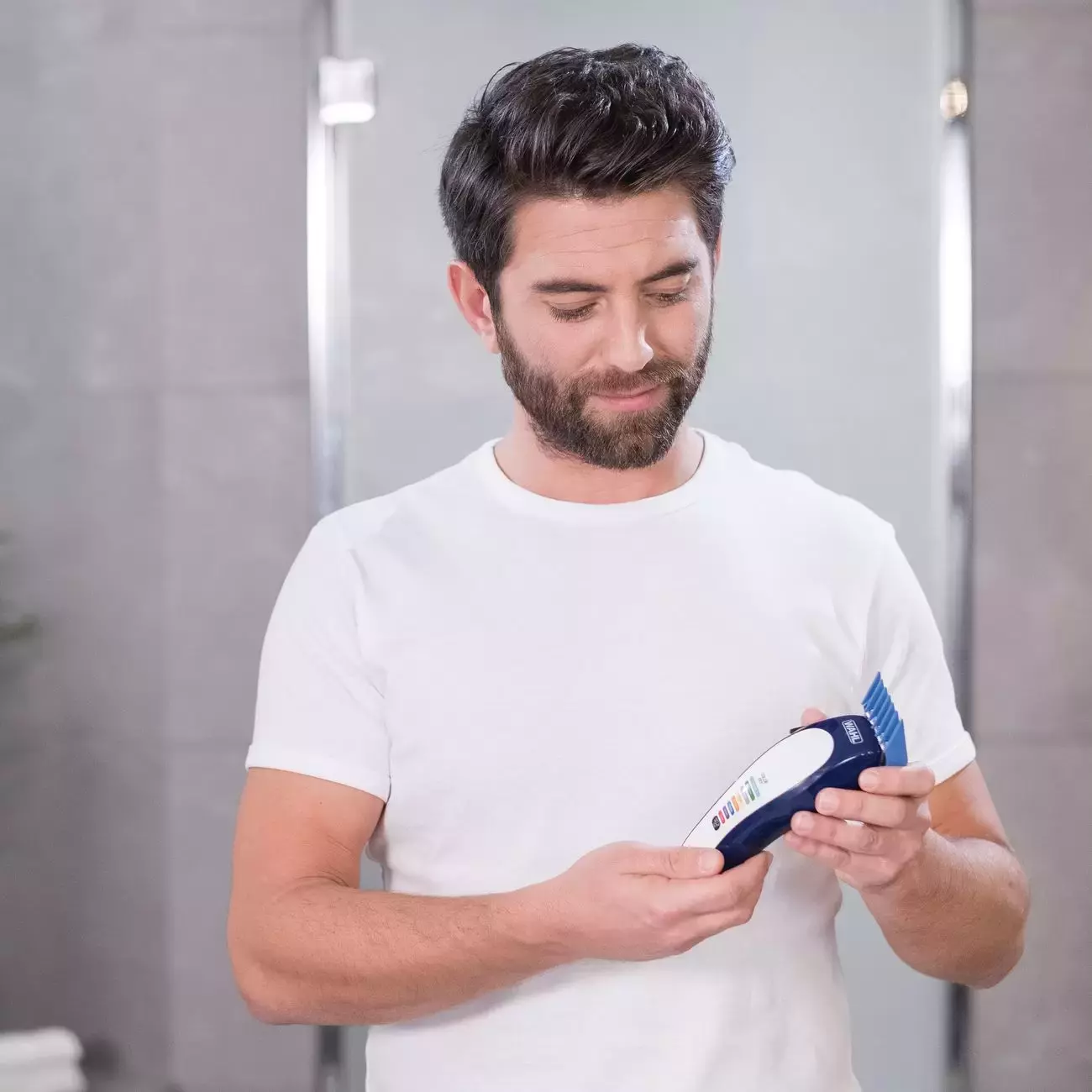 В этой модели установлены стальные самозатачивающиеся лезвия. Длина среза настраивается в диапазоне от 1 до 28 мм, для этого применяются съемные насадки-гребни. Корпус сделан из пластика. Размеры прибора — 24,1 х 18,7 х 7,6 см, вес — 288 г. К устройству прилагаются расческа и ножницы, масло для смазки, щеточка для чистки и чехол.