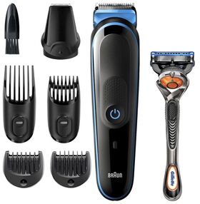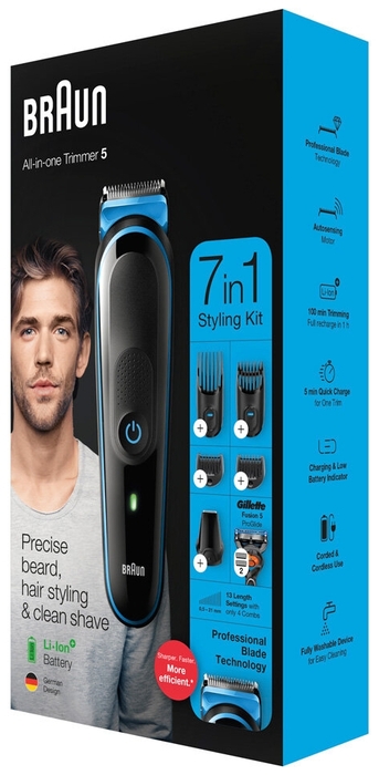 - бритва Gillette; насадка-гребень для коротких волос 3-11 мм; насадка-гребень для длинных волос 13-21 мм; насадка-гребень 2 мм; насадка-гребень 1 мм; насадка для точного стайлинга; зарядное устройство SmartPlug; щеточка для чистки
