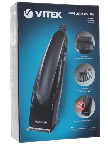 Вы страдаете нехваткой времени и не можете выделить лишний час на посещение парикмахера? Машинка для стрижки Vitek VT-2518 – устройство, которое позволит вам решить возникшую проблему. Эта машинка оснащена функцией регулировки, при помощи которой вы сможете самостоятельно выбрать желаемую длину стрижки в домашних условиях. Лезвия модели Vitek VT-2518 изготовлены из качественной нержавеющей стали – материала, благодаря которому они останутся острыми в течение продолжительного времени.