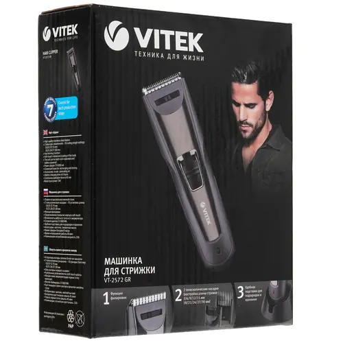 В Vitek VT-2572 GR предоставляется широкий диапазон регулировки длины стрижки. Минимальный параметр – 1 мм, максимальный – 30. Количество возможных установок – 11. Настройка длины осуществляется путем смены двух насадок и параметров непосредственно на машинке.