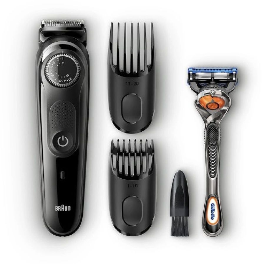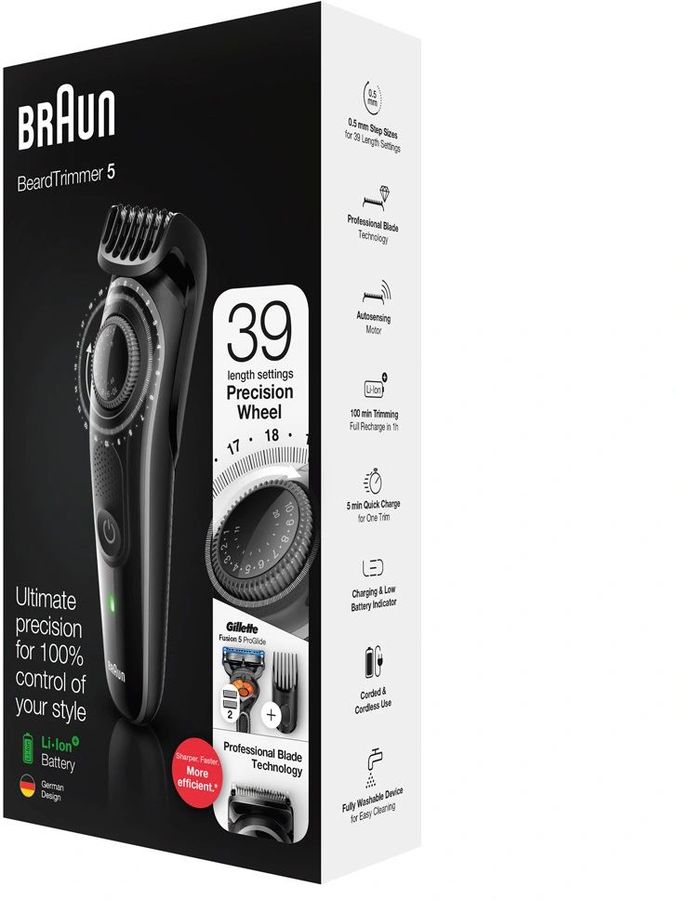 Особенности В комплекте: Триммер для бороды Braun BT5242 в цвете черный/серый, насадка-гребень для коротких волос (1-10 мм), насадка-гребень для длинных волос (10-20 мм), бритва Gillette Fusion ProGlide с технологией FlexBall, щеточка для чистки, зарядное устройство Smartplug.