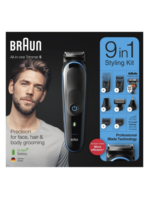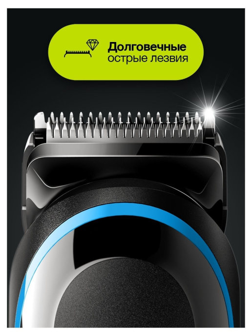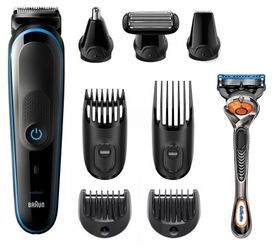 - насадка-гребень для коротких волос 3-11 мм; насадка-гребень для длинных волос 13-21 мм; насадка-гребень 2 мм; насадка-гребень 1 мм; насадка для точного стайлинга; насадка для носа и ушей; бритвенная насадка для тела; бритва Gillette Fusion ProGlide
