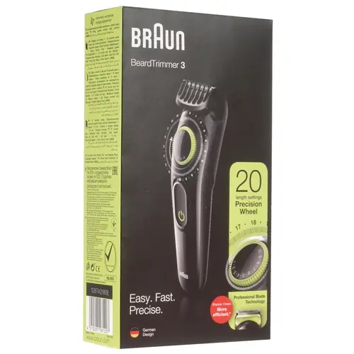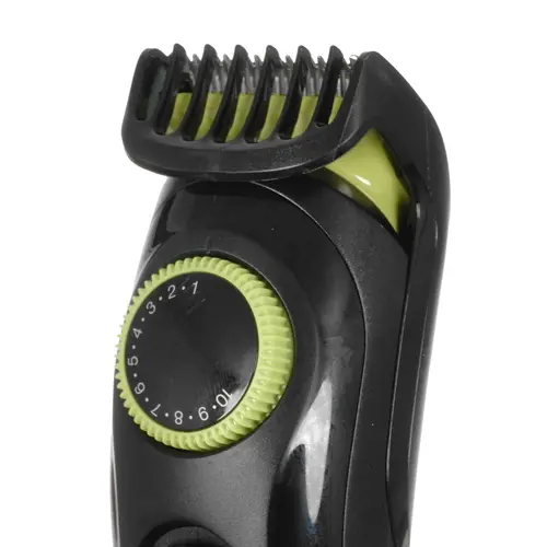 Устройство с роторным двигателем и встроенной АКБ работает без подзарядки 50 минут, чего вам хватит на несколько дней. На корпусе имеются яркие индикаторы уровня заряда и выбранной длины стрижки. Триммер поставляется со съемной насадкой, щеточкой для чистки и ЗУ.